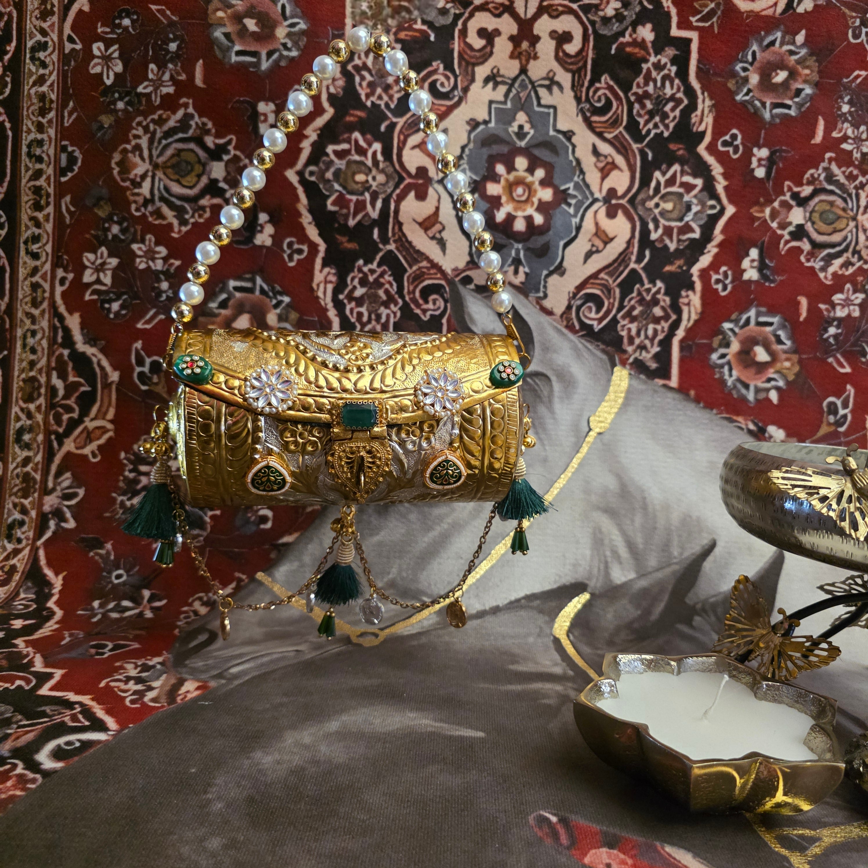 Brass bag in dual gold and silver shaded plating handcarved ,adorned with kundan and stones studs.
