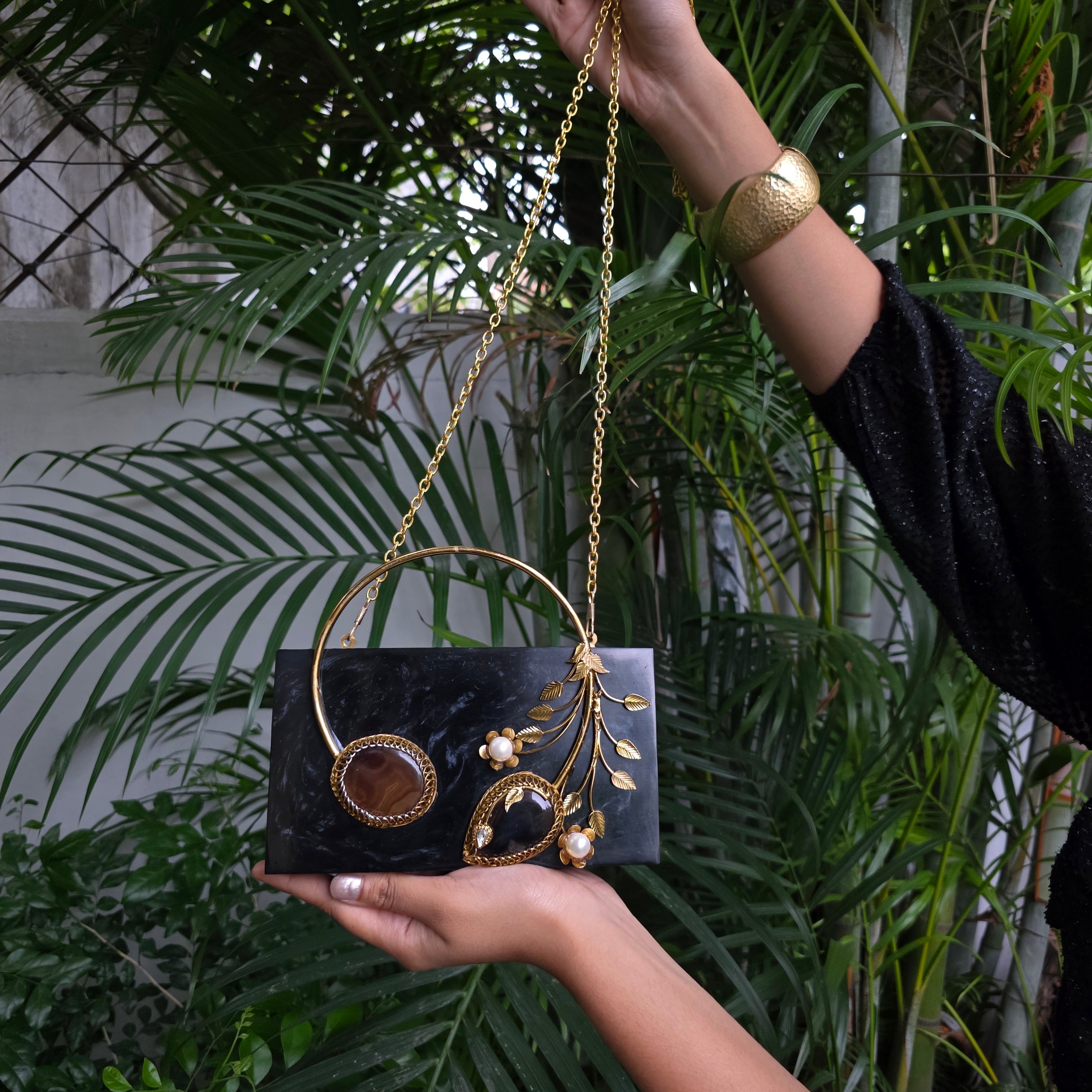 Handcrafted resin bag adorned with brass stone handle in gold electroplating.