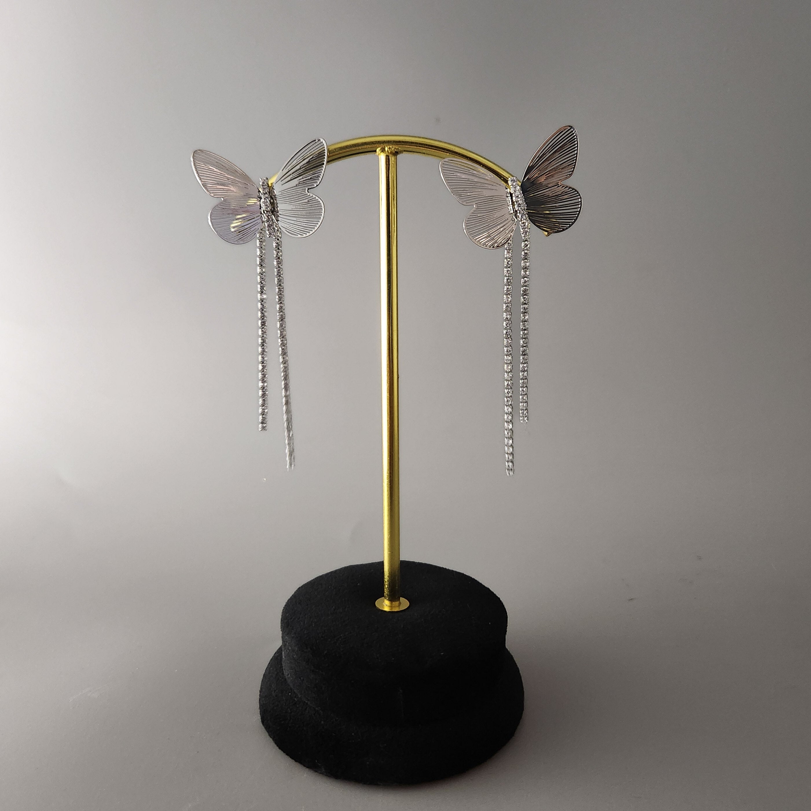 Dual style earring in stainless steel earrings. Can be worn as separate butterflies as well as butterfly with the rhinestone hanging.