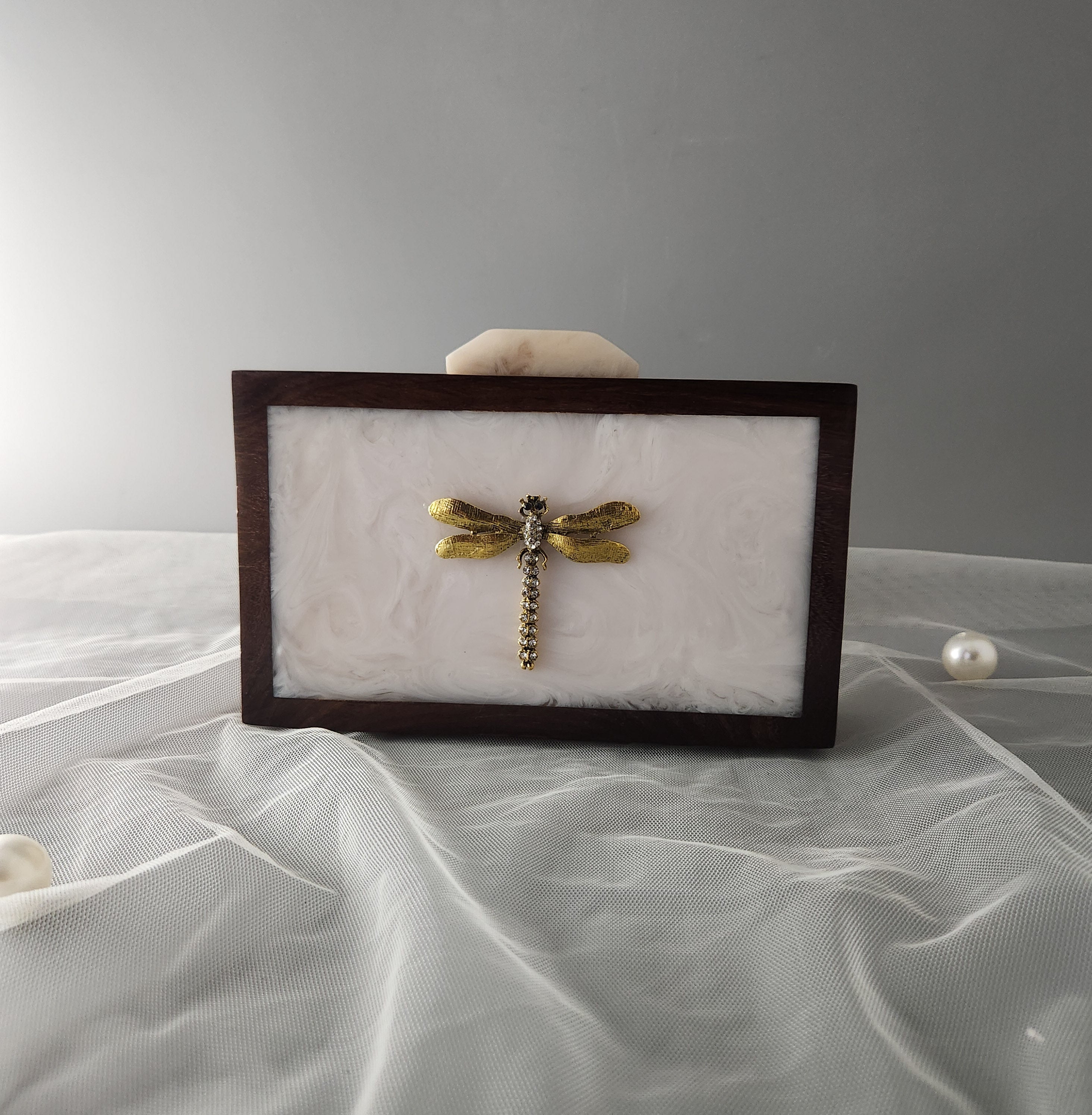 Wooden bag made in Sheeham wood with resin on one side , resin top knob , magnetic closure adorned with a dragonfly metal broach.