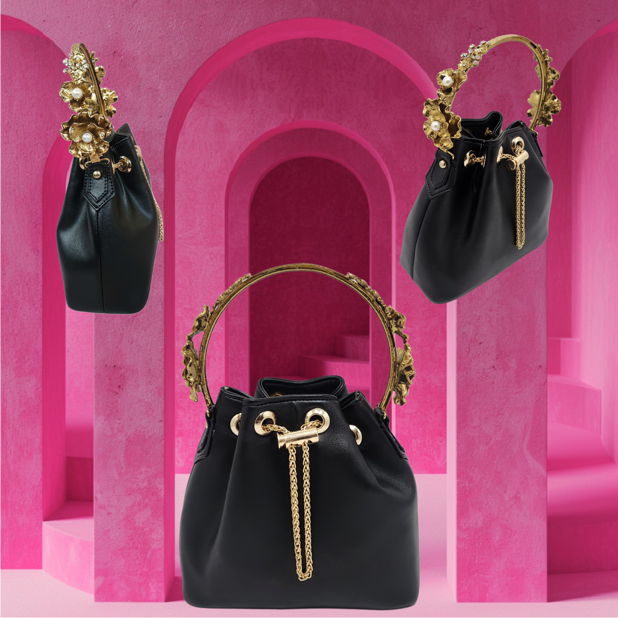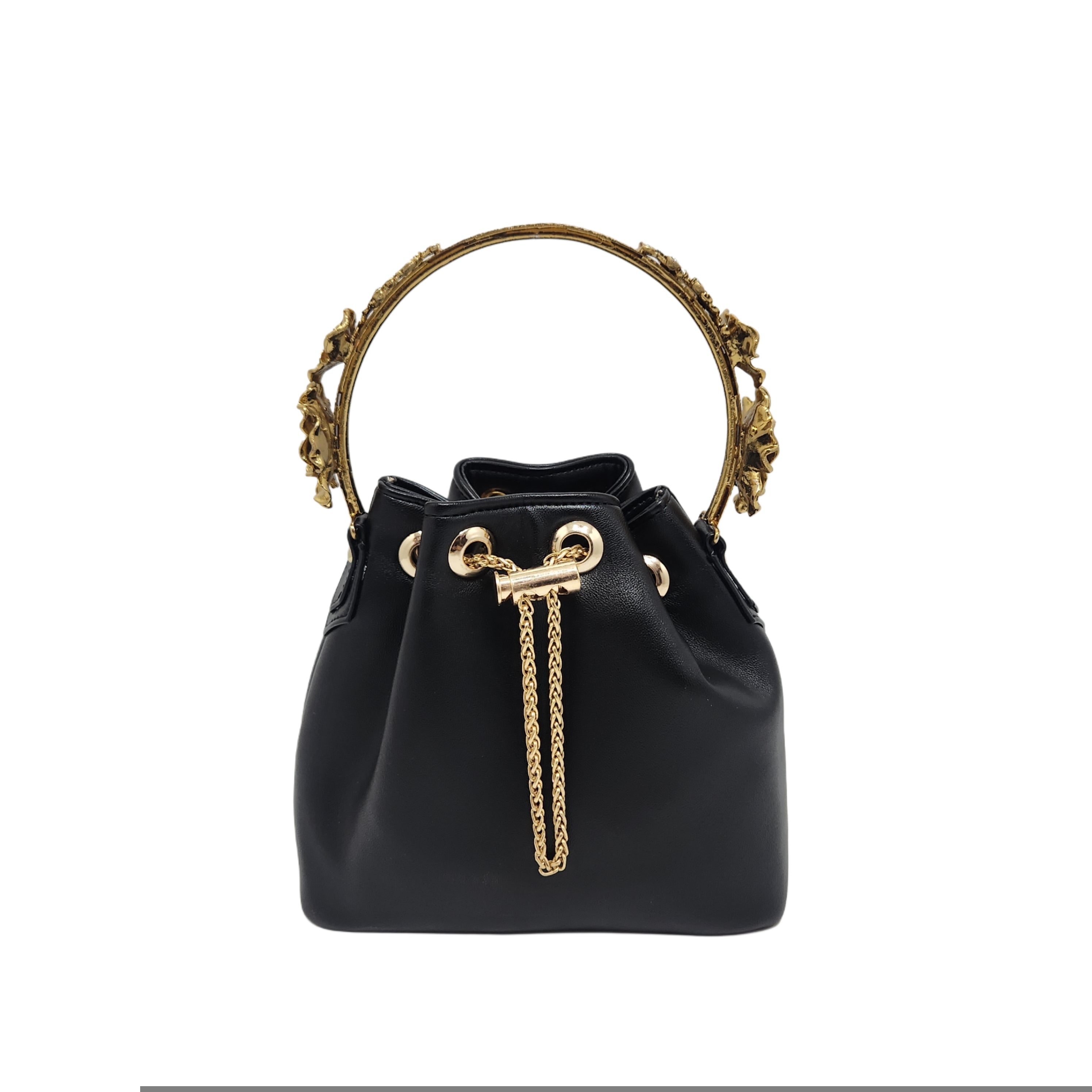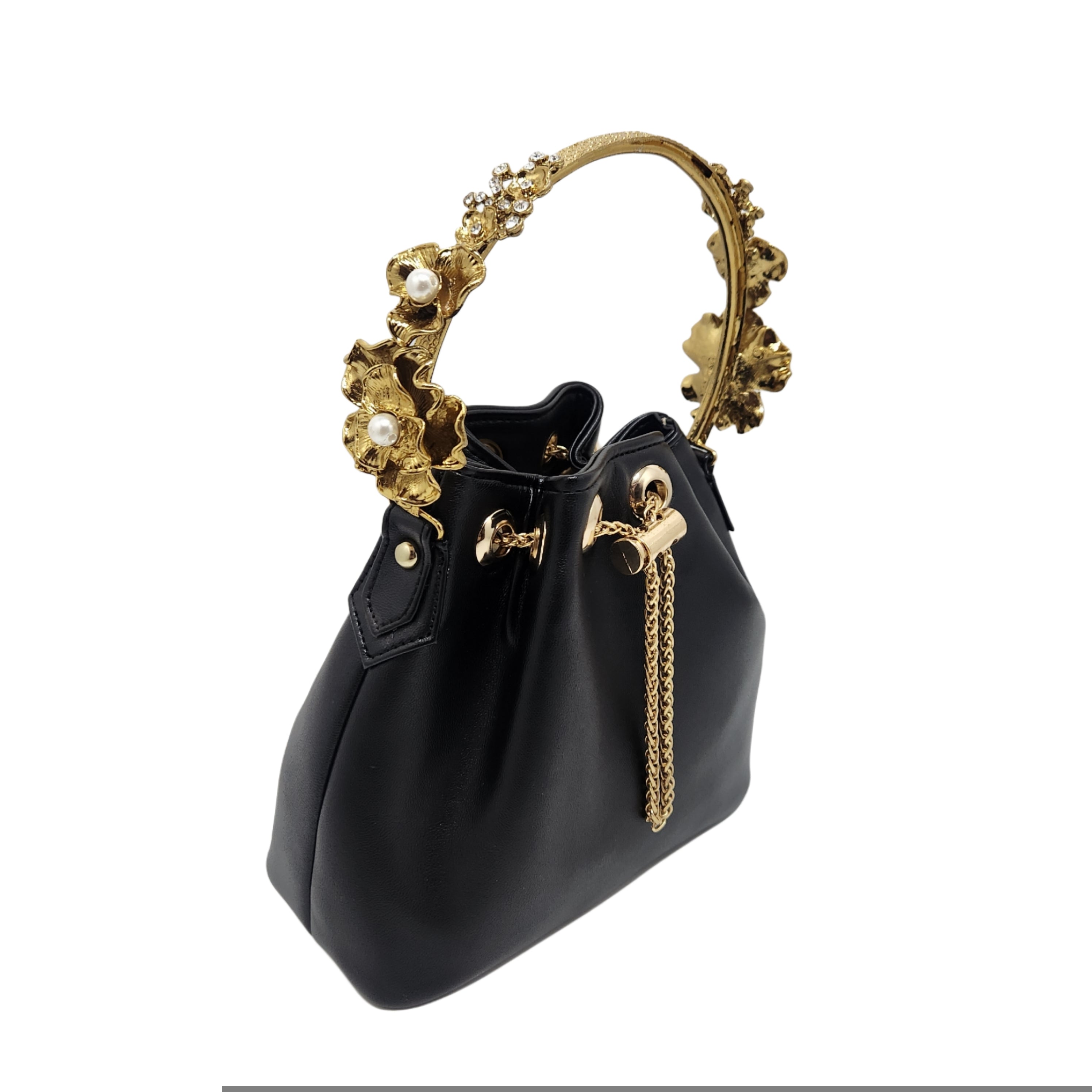 Vegan leather bucket bag in black with a handcrafted brass floral handle in gold electroplating.