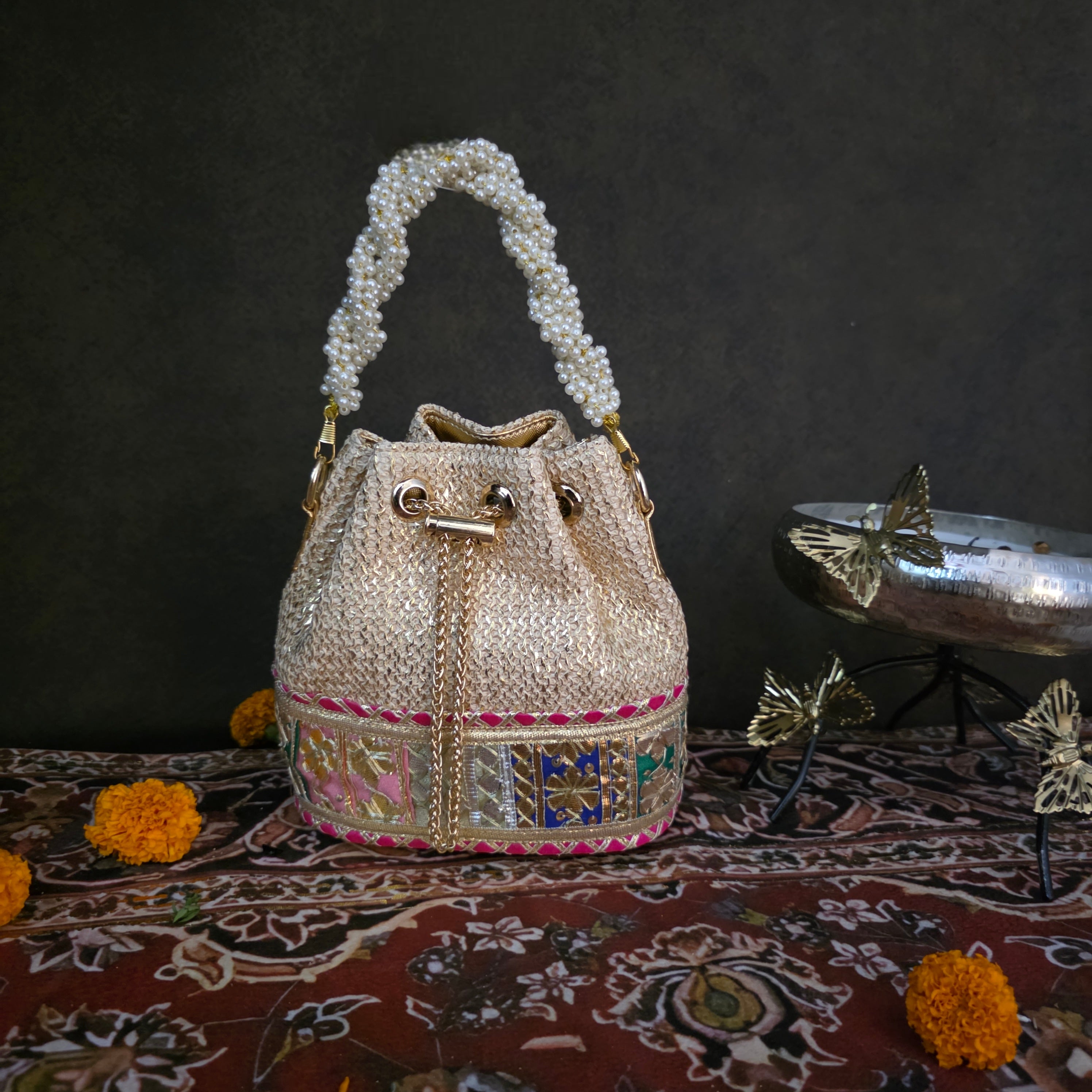 Bucket bag style with gotapatti work .. the bag comes with a detachable handle and one crossbody chain.
