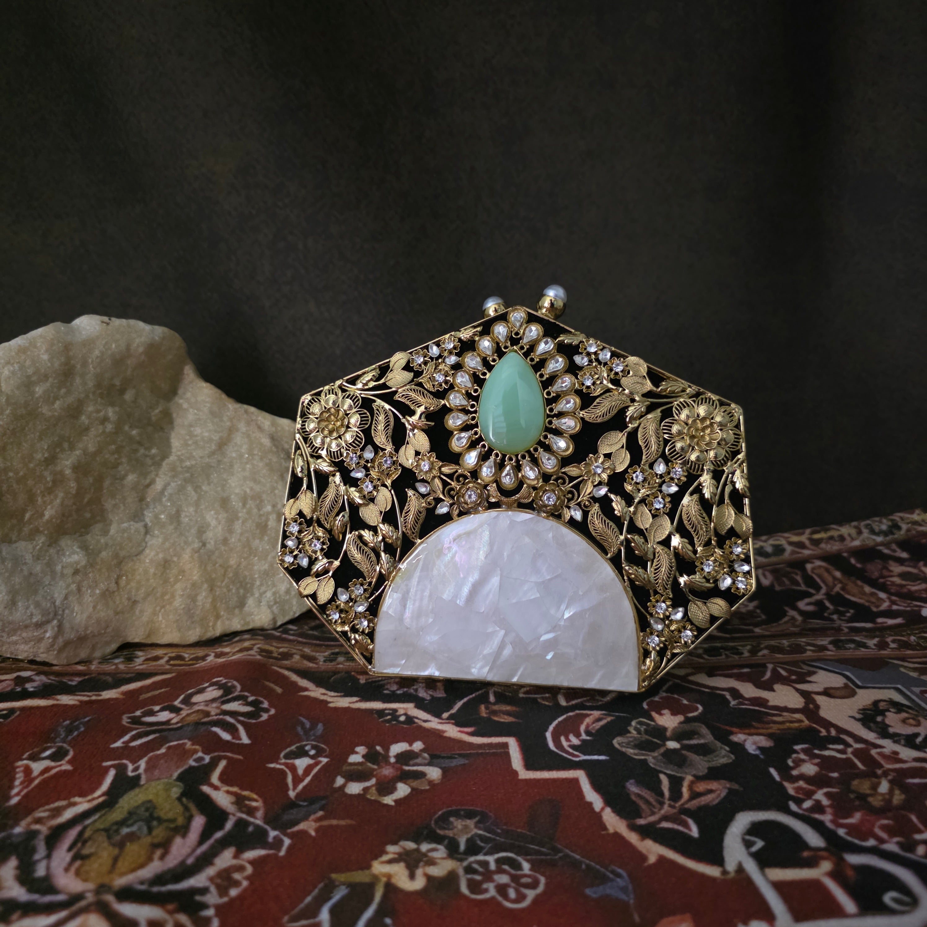Exquisitely handcrafted, this heirloom bag blends timeless artistry with luxurious detail. The body is crafted from radiant brass, intricately inlaid with luminous mother-of-pearl, creating a shimmering mosaic effect. At its heart, a polished green Amazonite stone adds a touch of serenity and charm, symbolizing harmony and elegance. Designed to be both a statement accessory and a treasured keepsake, it’s perfect for festive season.