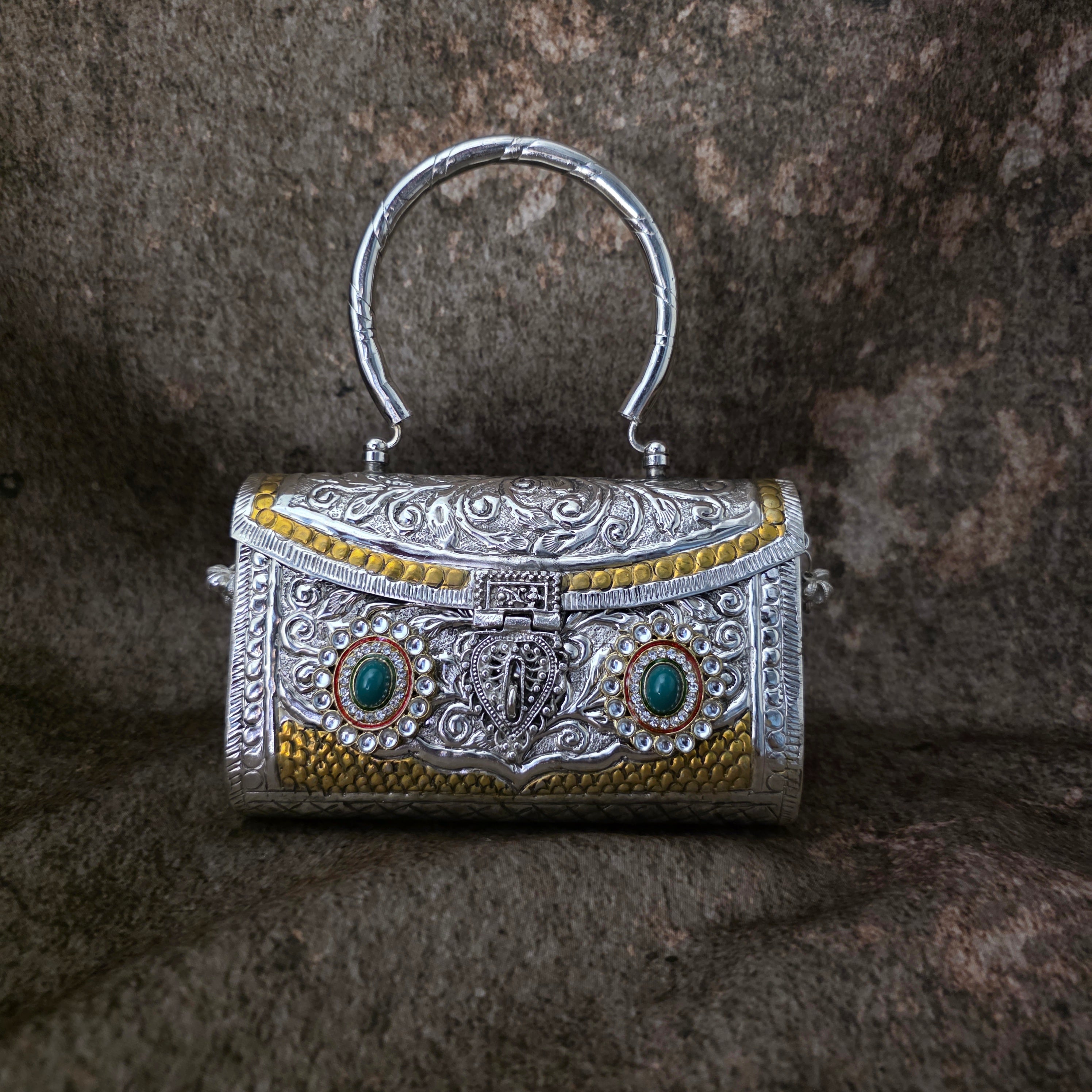 Hand carved brass bags adorned with Kundan stone studs. The bag has silver and gold polish. Can be replaced.