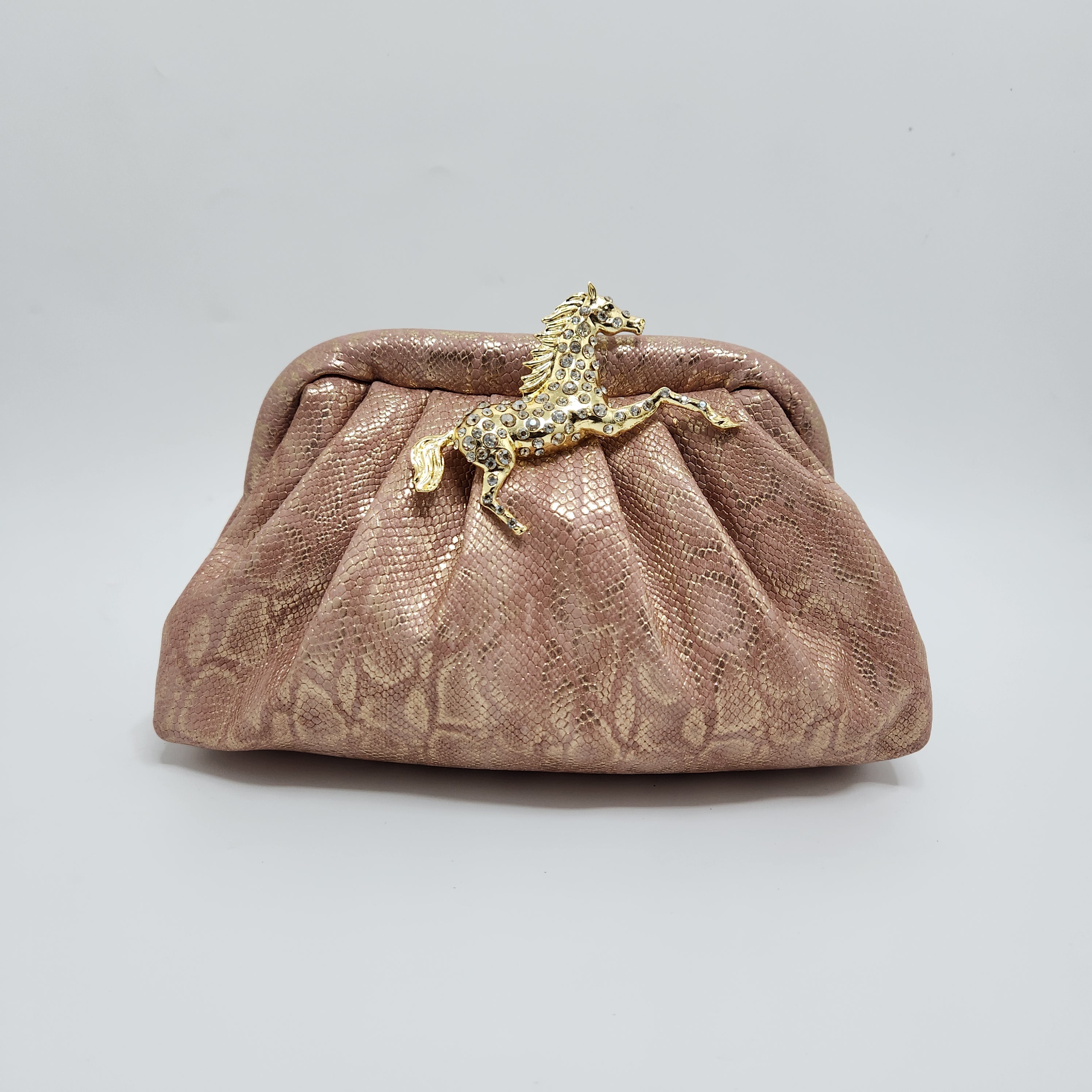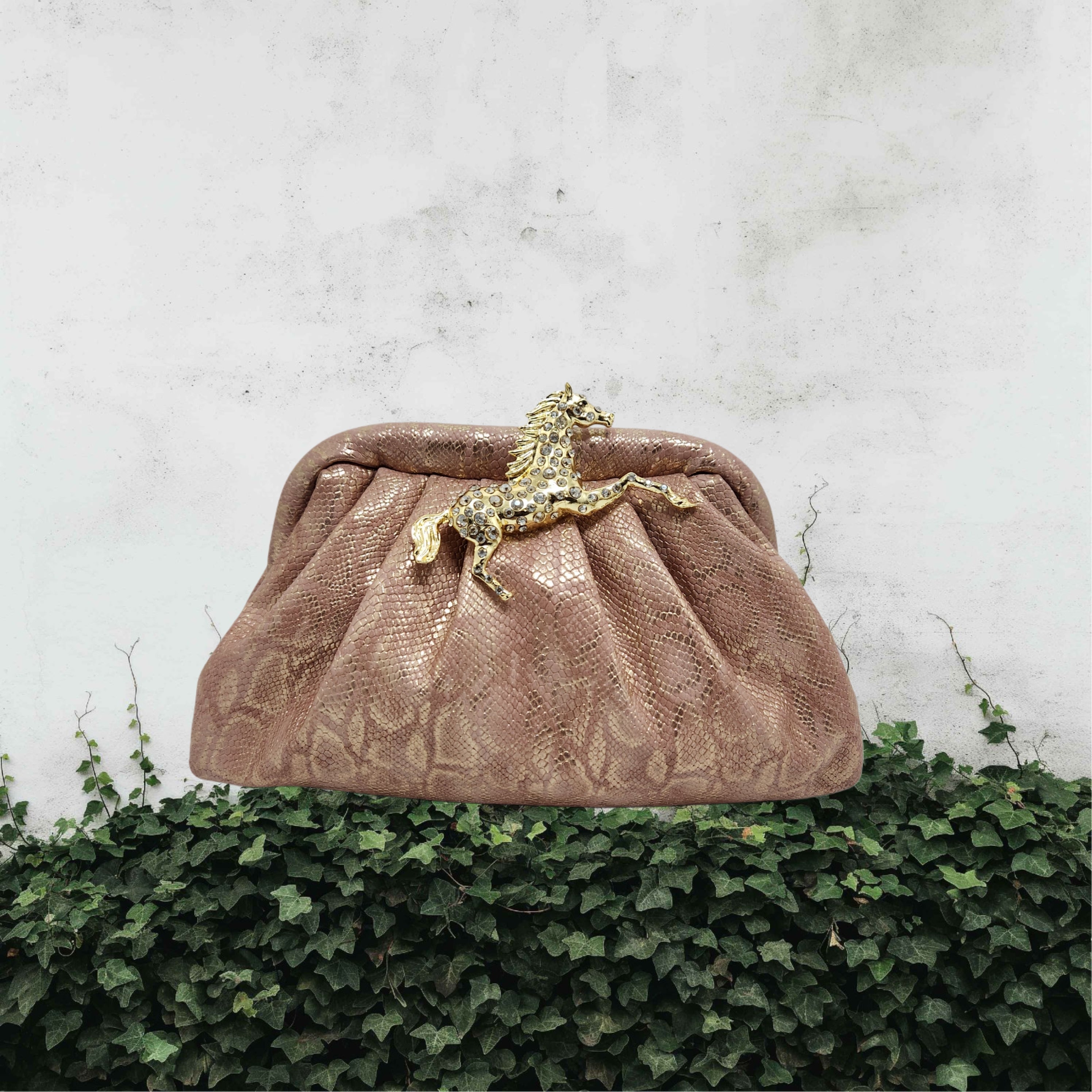 Pouchette style bag with pressure open and close mechanical frame adorned in vegan leather in different shades with a metal horse broach.