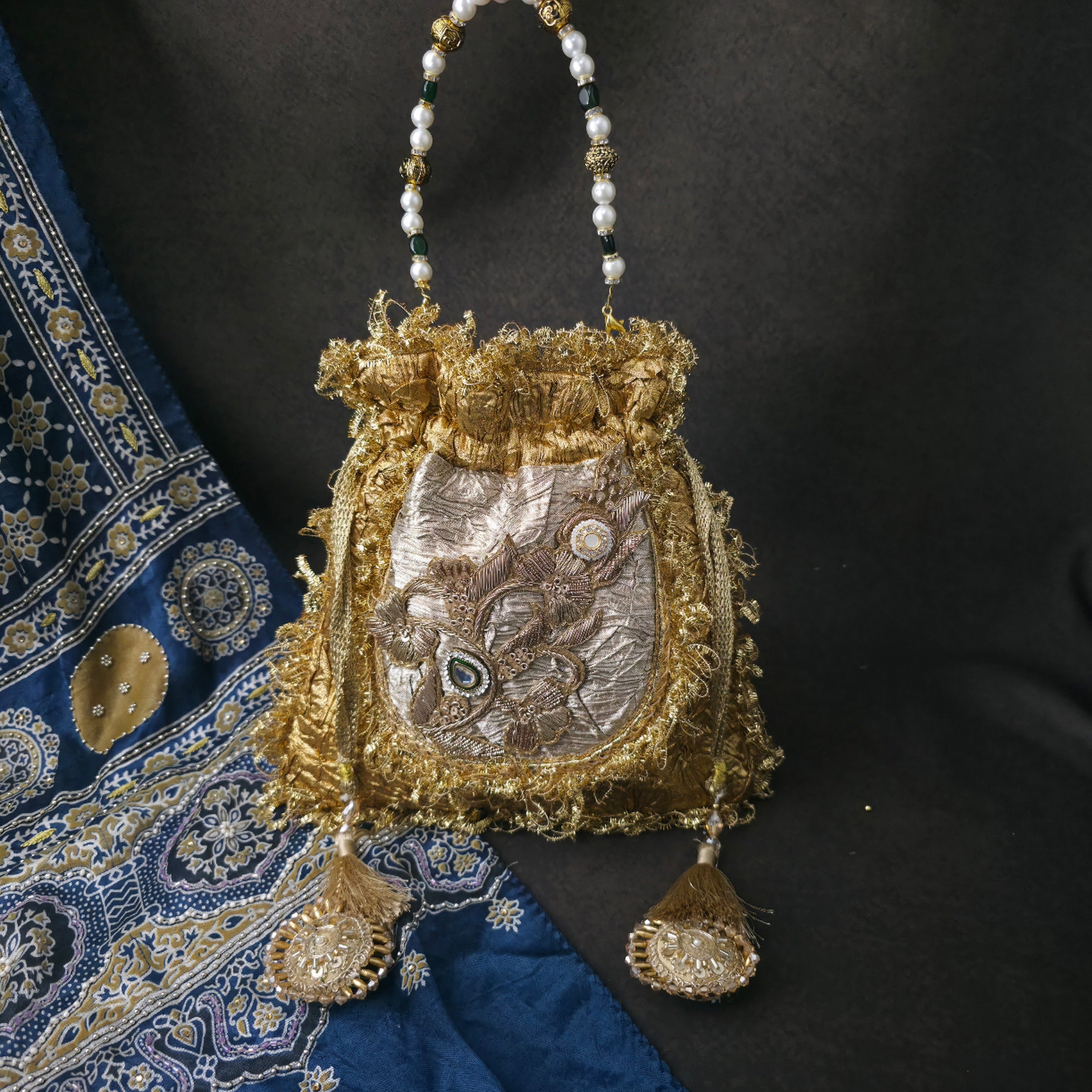 Crush tissue dual shade gota Cardoso kundan stud potli .