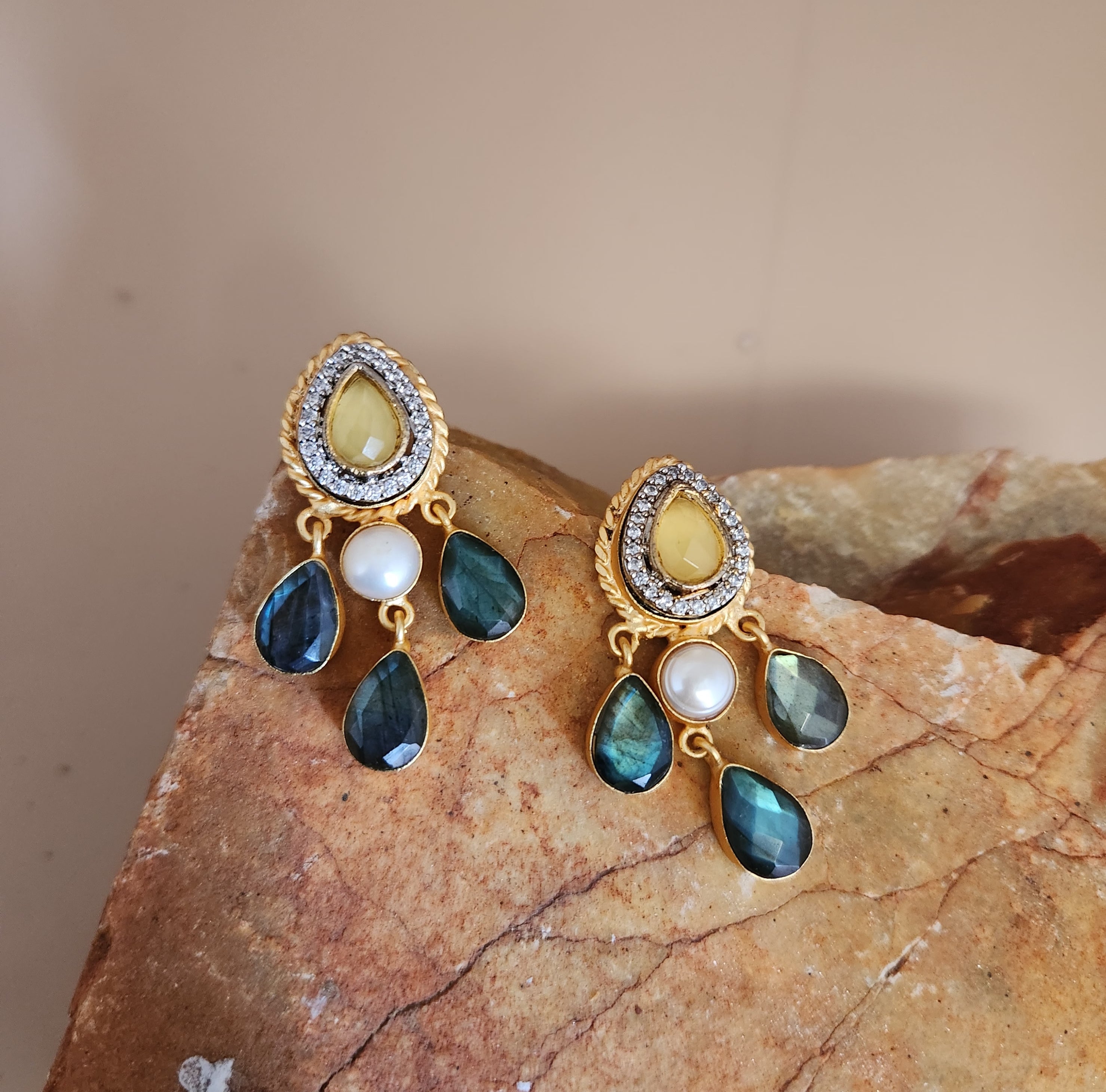 Labradorite, fresh water pearl and monalisa stone with zirconia dangler made in brass with gold electroplating.