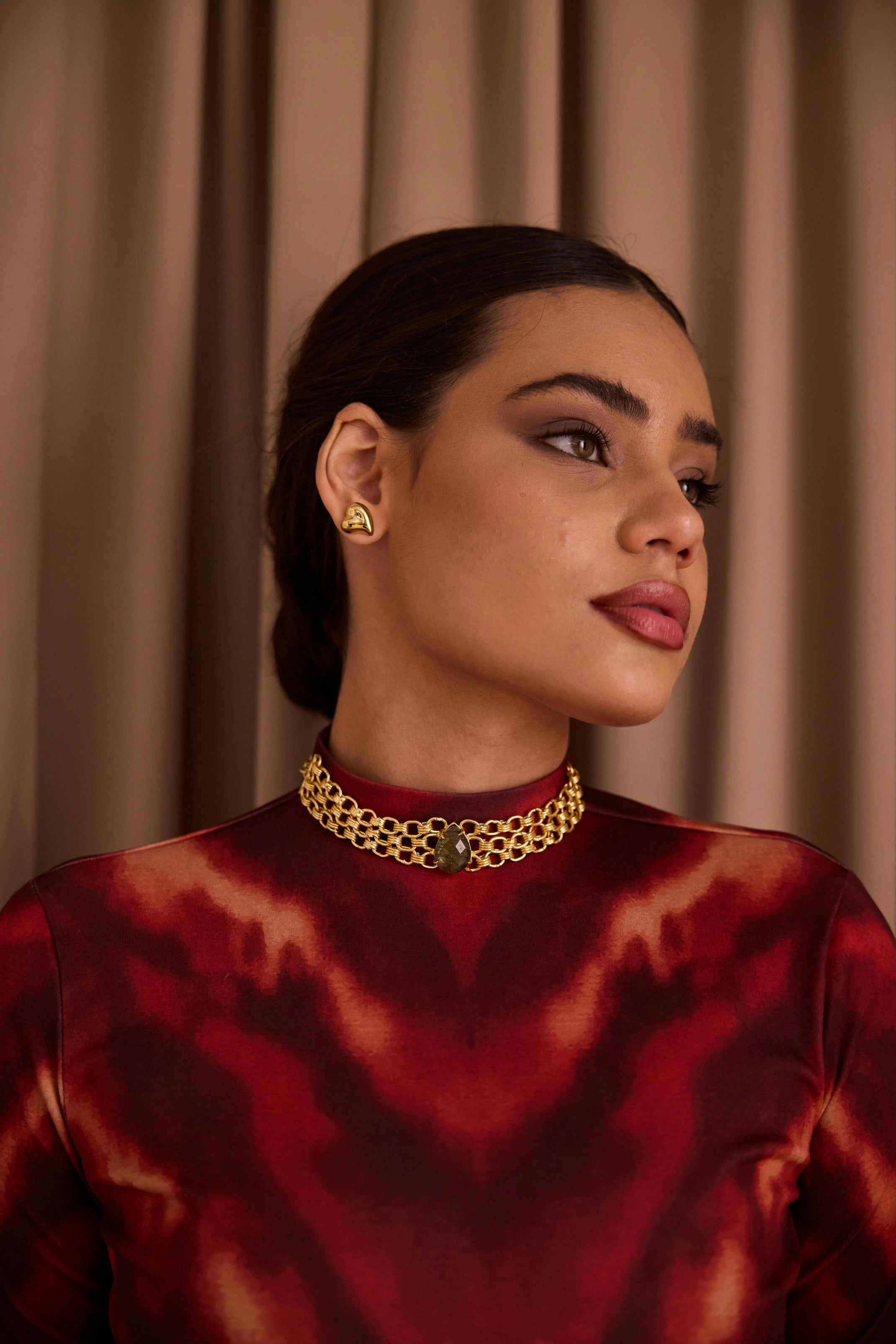 Handcrafted brass chain choker with labradorite stone and gold electroplated.