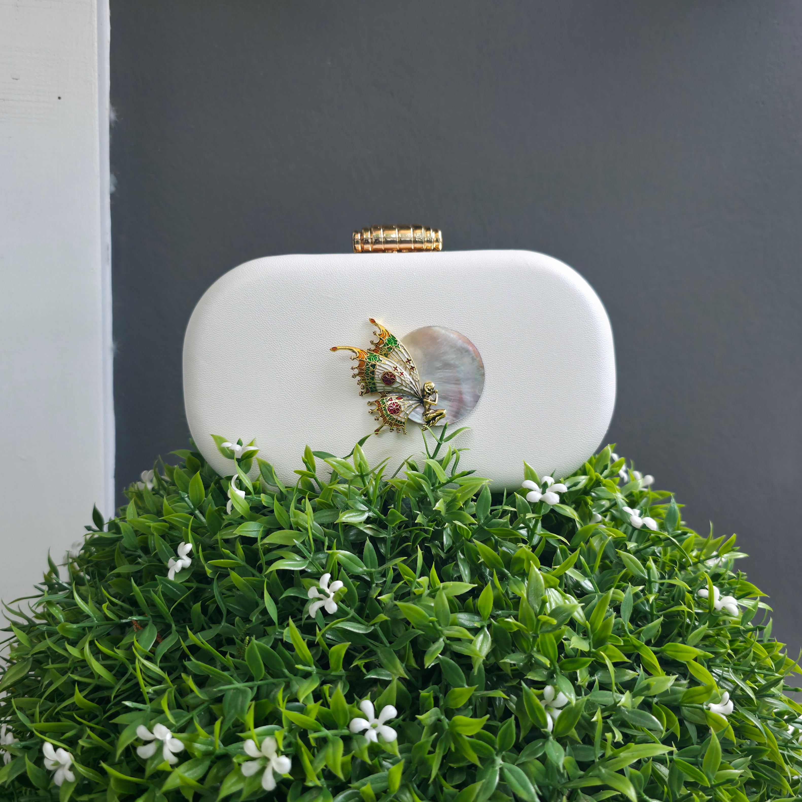 Sleek capsule style frame clutch bag with leatherite, mother of pearl shell and a fairy lady broach.