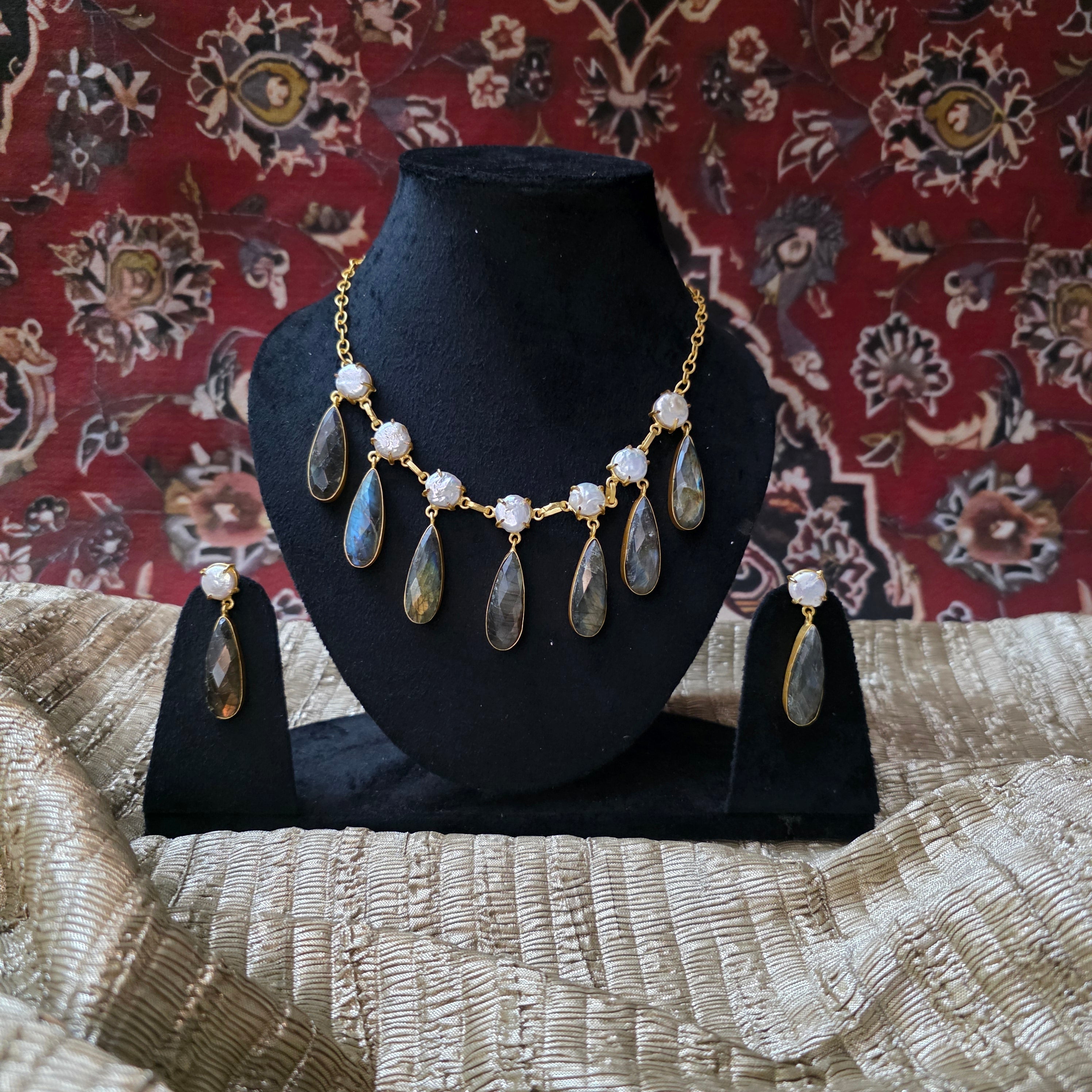 Handcrafted mother of pearl and labradorite fusion necklace set in brass and gold electroplated.