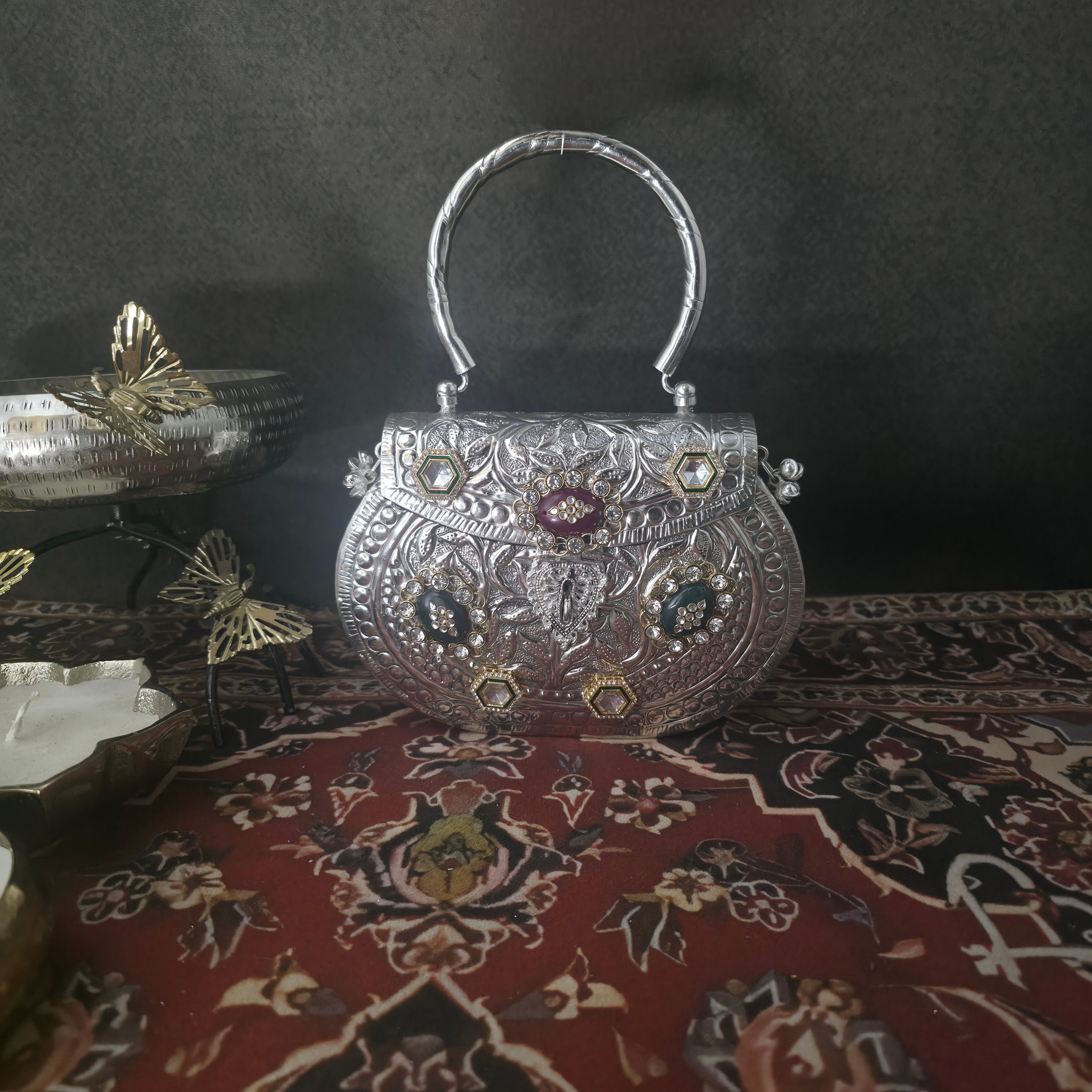 Handcarved brassbag with silver polish adorned with stones and crystals .