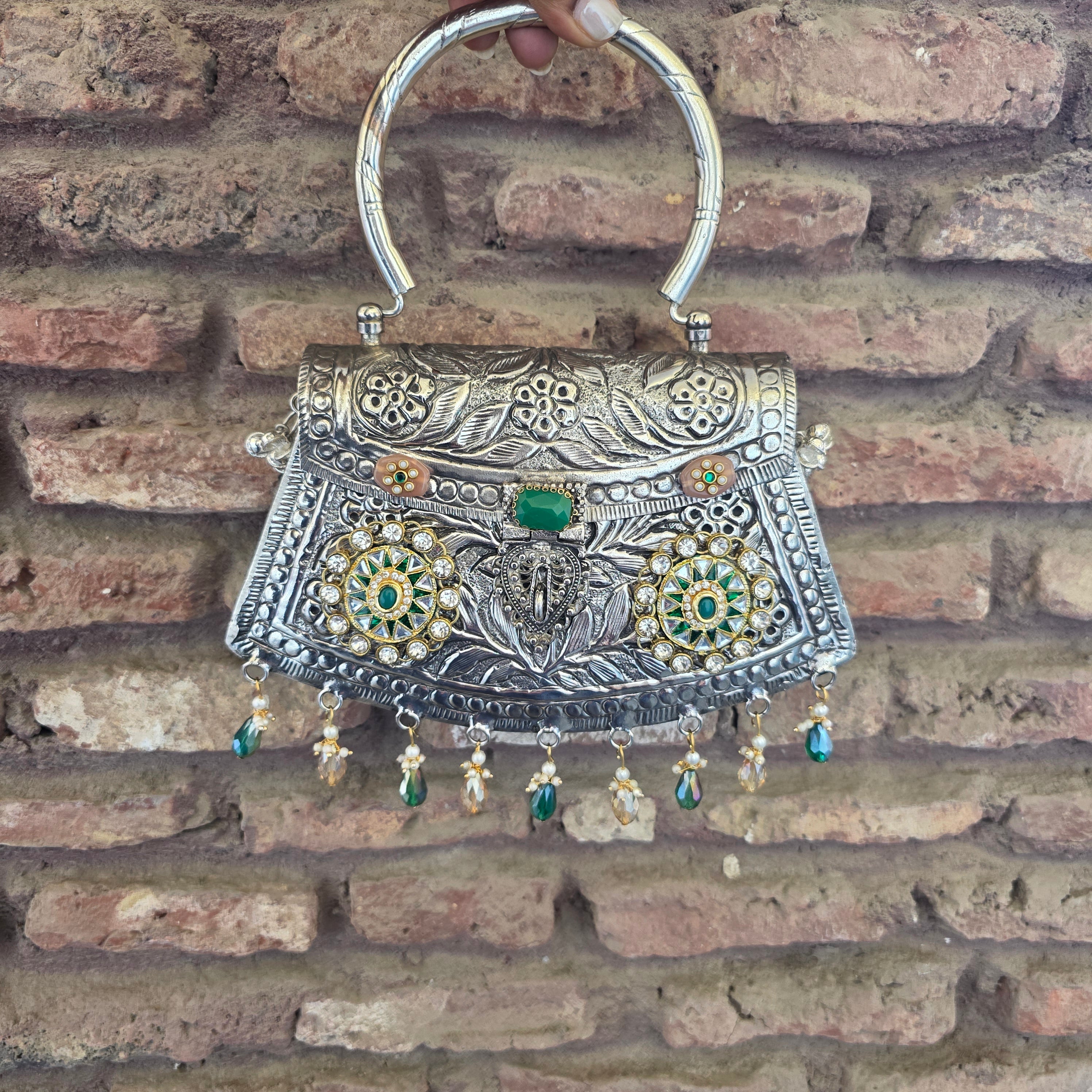 All bags are handcarved in brass . The plating of the silver plated bags Is not a bright silver plating but on the dull side.