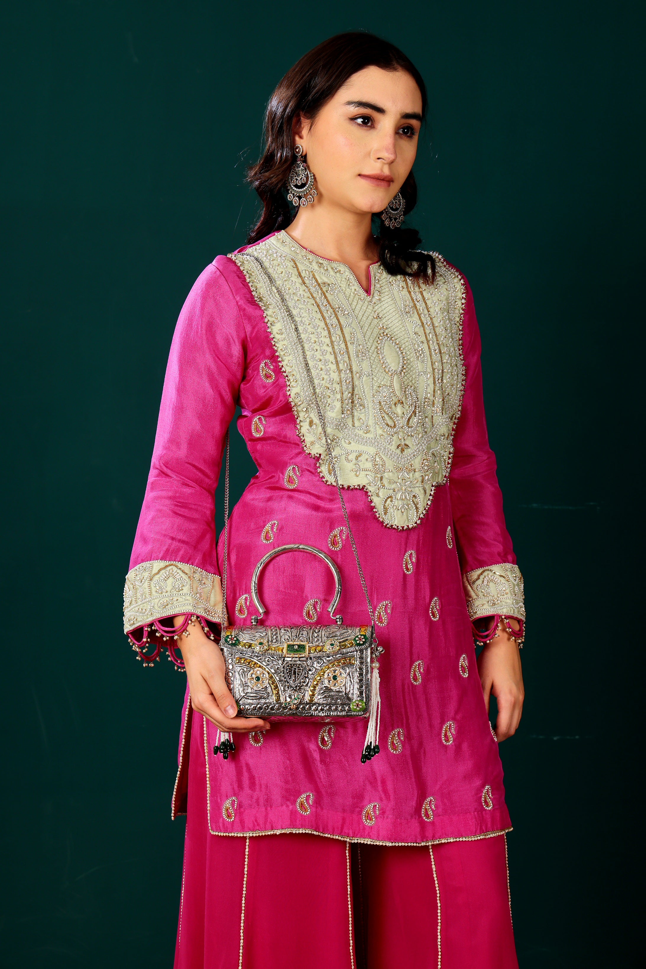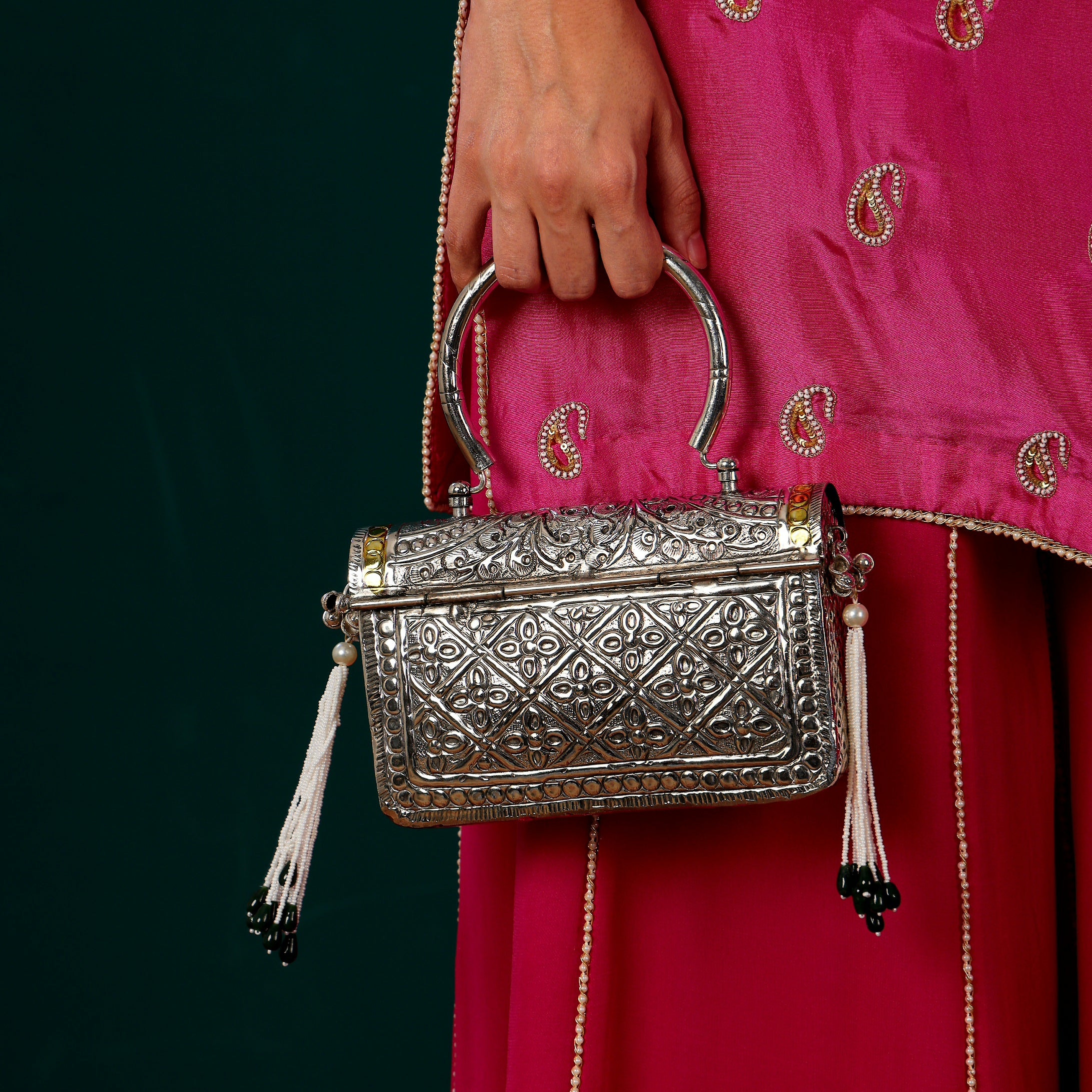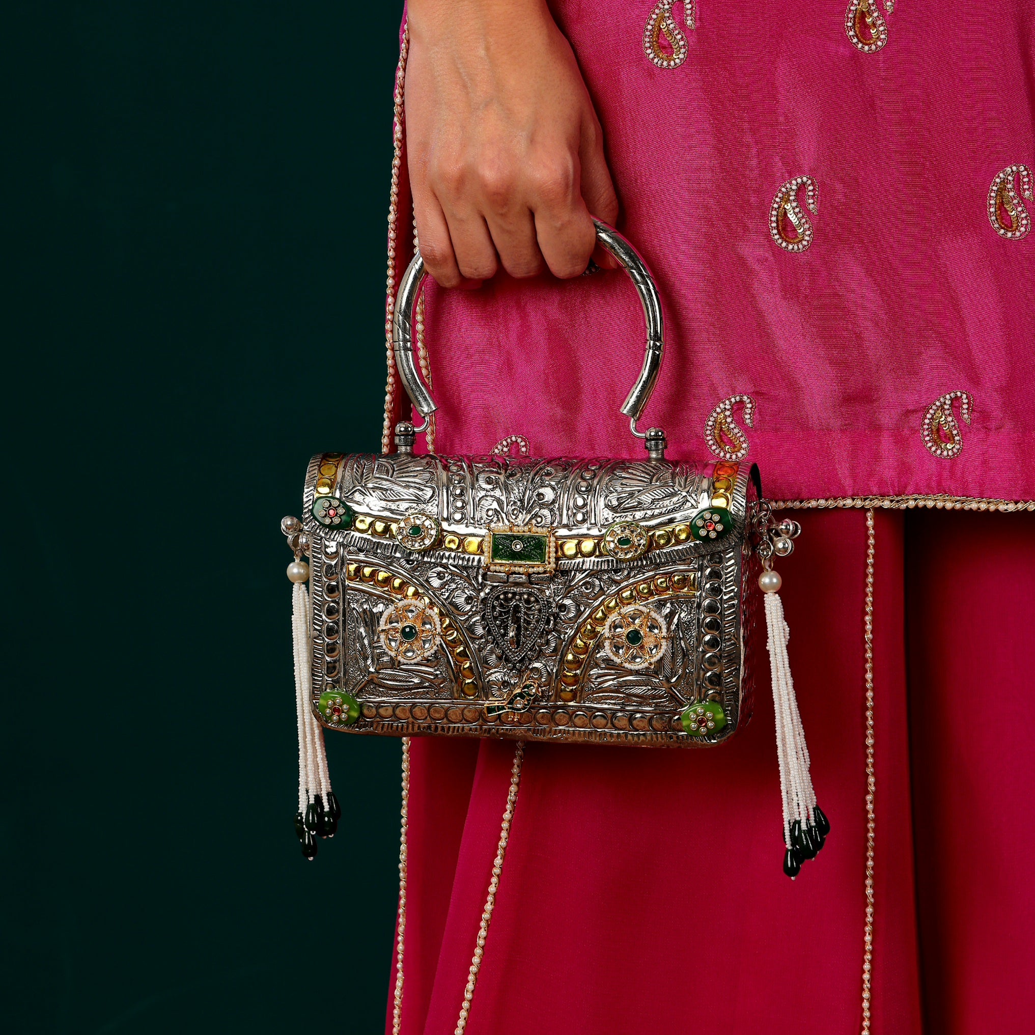 Handcarved brass bag with silver plating and gold highlighting adorned with kundan and stones