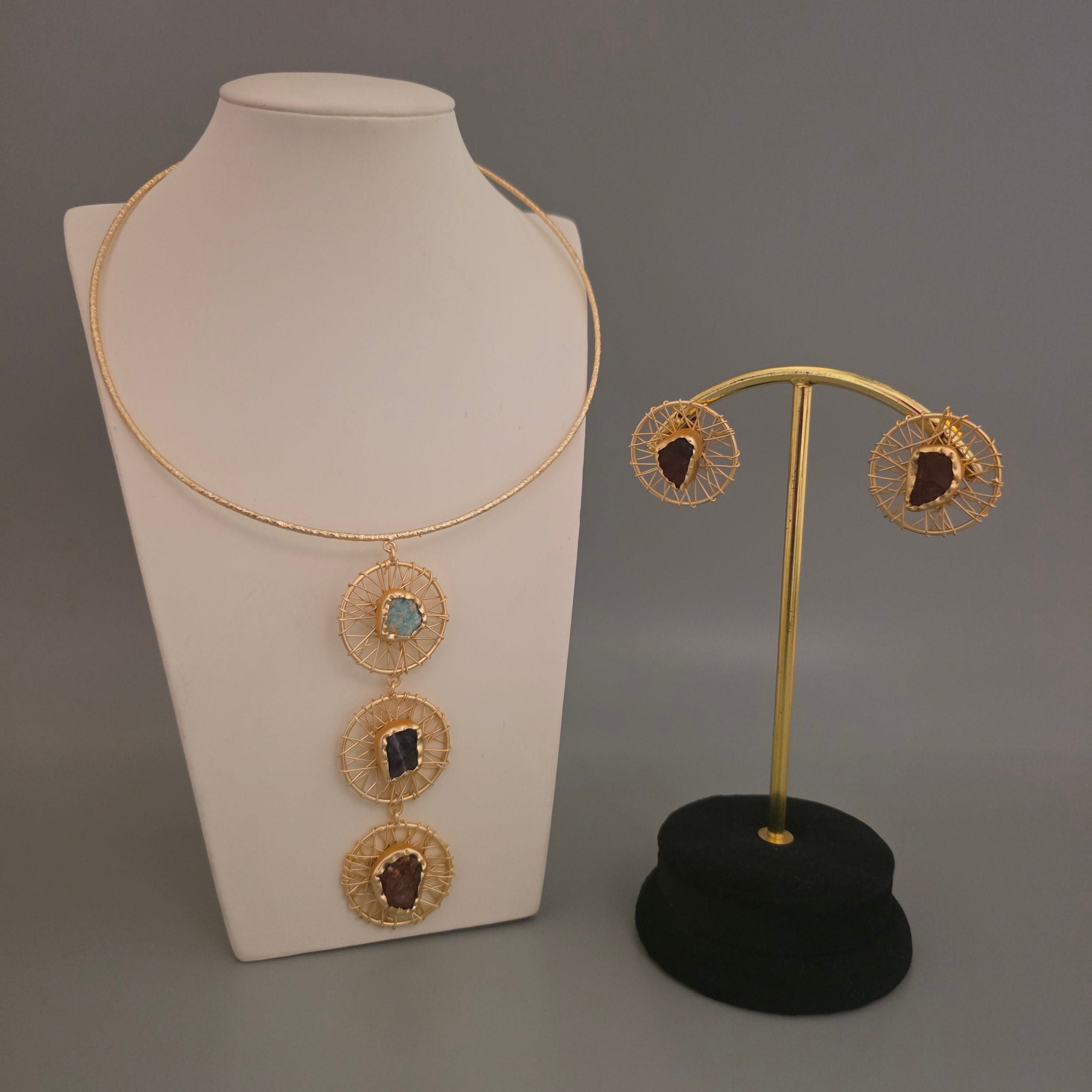 Brass hand made hasli necklace set with earrings. Natural stones used .